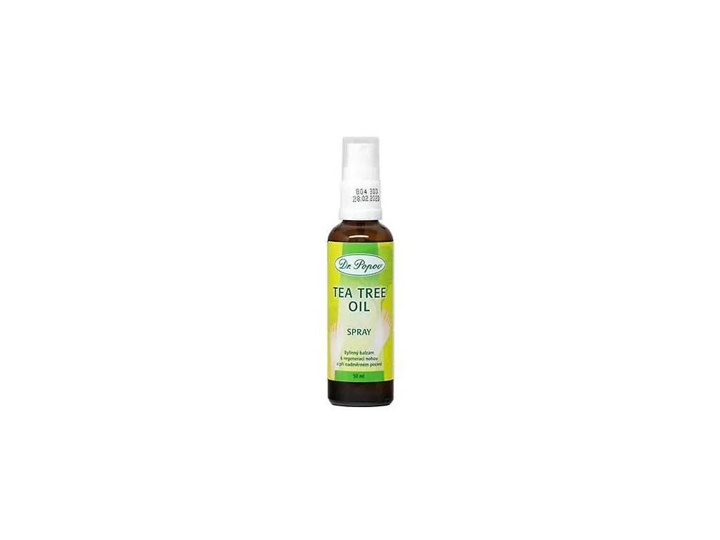 Tea Tree Oil spray Dr. Popova je vhodný k dezinfekci nohou. Skvěle působí při prasklinách kůže, únavě nohou, nadměrném pocení a zápachu chodidel. Účinně osvěžuje a regeneruje. Vhodný je také k ošetření nohou po použití společných sprch, šaten, bazénů apod. Obsahuje Tea Tree oil v lékopisné kvalitě, výtažek bylin a vysoké % alkoholu. Zároveň obsahuje zvlhčovací složku glycerin, která snižuje vysušení pokožky. Velmi rychlé a příjemné použití ve spreji. Dobře a rychle zasychá.