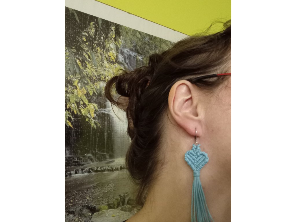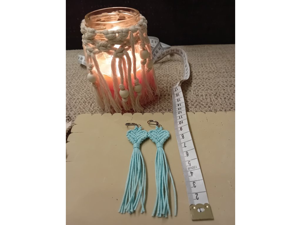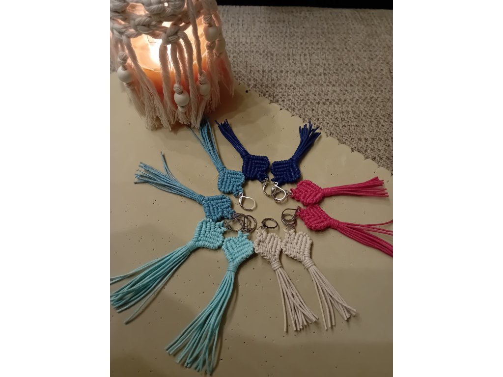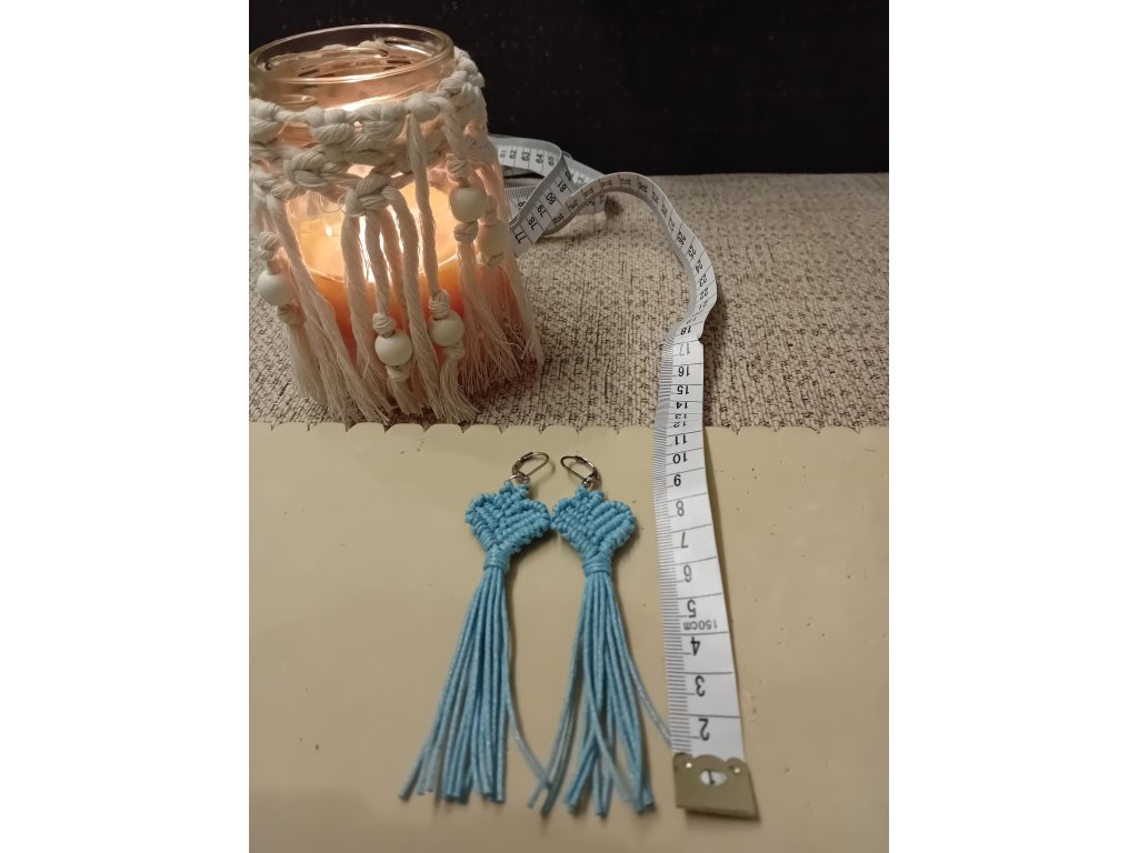 Vyrobena z bavlněné šňůry o šíři 1 mm. Háčky z chirurgické oceli (uzavíratelné možné vyměnit za afroháčky). Délka náušnic lze díky netřepivému materiálu krátit (od 3 do 9 cm, bez háčku). Barvy: přírodní, modrá světlá "andělská", modrá, tmavě modrá a malinová.