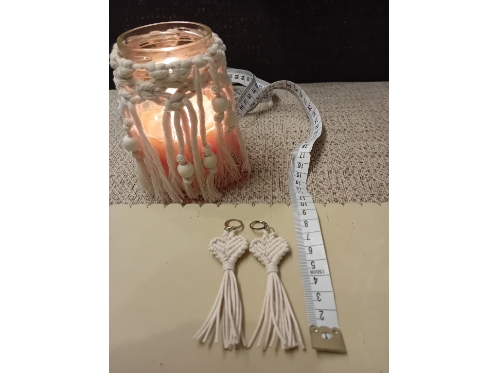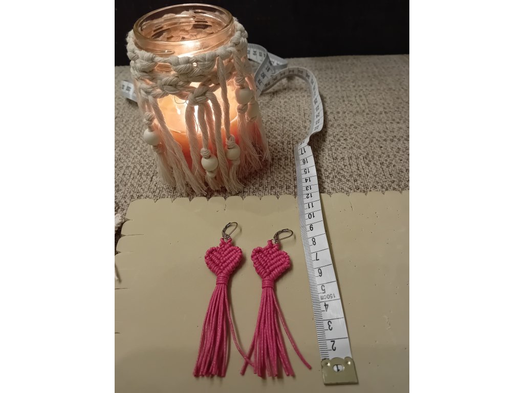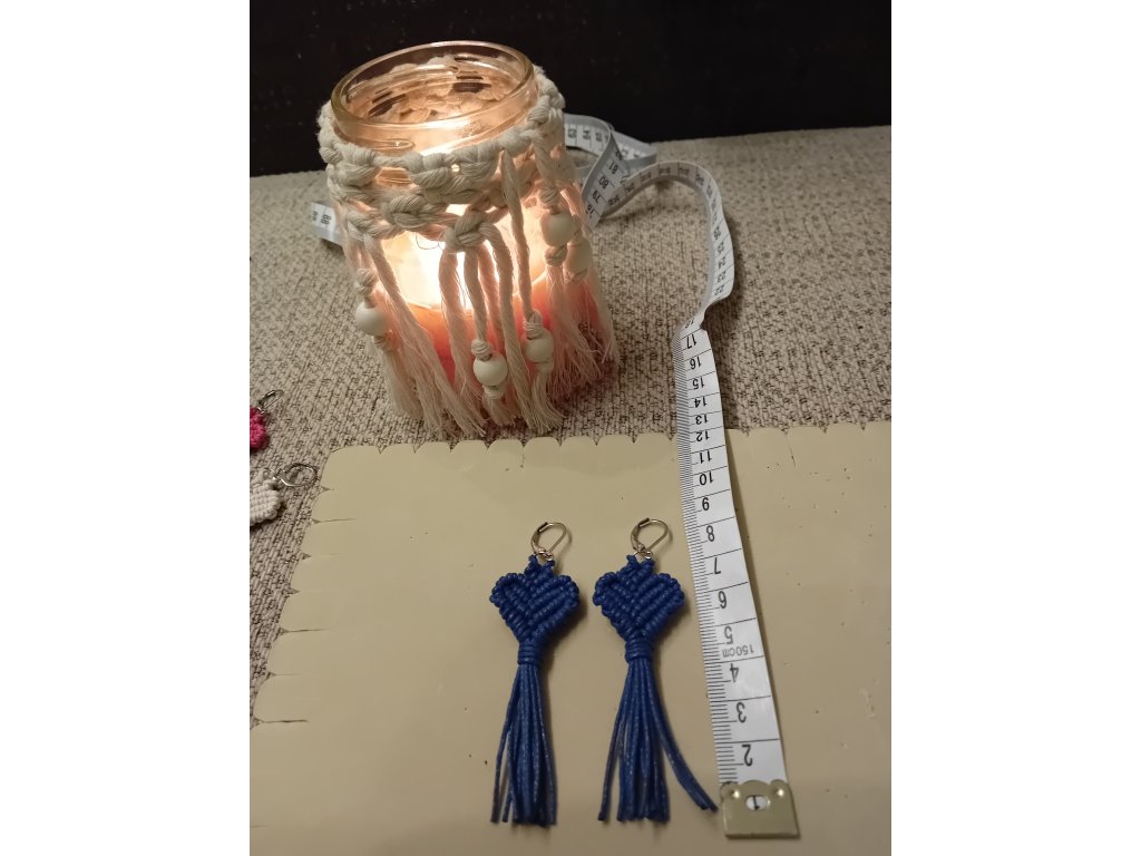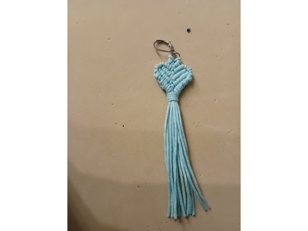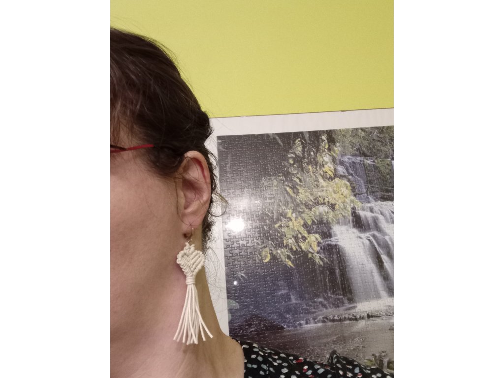 Vyrobena z bavlněné šňůry o šíři 1 mm. Háčky z chirurgické oceli (uzavíratelné možné vyměnit za afroháčky). Délka náušnic lze díky netřepivému materiálu krátit (od 3 do 9 cm, bez háčku). Barvy: přírodní, modrá světlá "andělská", modrá, tmavě modrá a malinová.